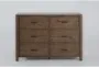 The Kai Brown 6-Drawer Dresser brings rustic charm to your bedroom while providing ample storage space. Constructed from oak veneers and solid rubberwood, this dresser ensures durability and longevity. Its natural brown finish enhances the rustic appeal and complements a variety of bedroom décors.