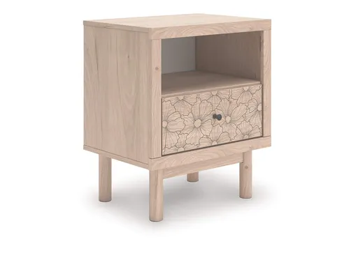 Looking for a nightstand that's both playful and practical for your little one? This piece is just the ticket. Its charming design and light wood finish create a whimsical and inviting atmosphere. A floral-patterned drawer adds a free-spirited vibe and plenty of bedside storage, so there's no excuse for a messy room. And a USB charger located on the back makes this nightstand that much more functional.
