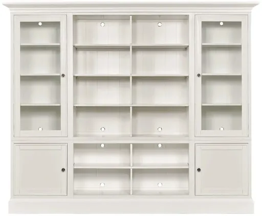 In this 106 inch long configuration, the Structures wall system features open shelf display in the center. The shelves are all adjustable and removable. By removing the shelves in the center unit, the system can be used for a television with an opening that is 47.5" wide.