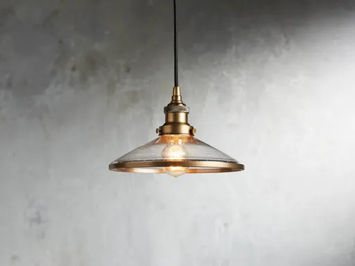 Seeded glass shades are accented with industrial brass detailing, giving our Industrial Pendant Collection a look that’s simple yet refined.