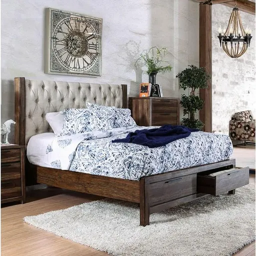 Set the scene for serene relaxation with this beautiful set and its gorgeous rustic natural tone finish. Diamond tufting can be found all along the fabric upholstered wingback style headboard while the wood grain emphasizes the natural finish. Footboard drawers provide ample storage. The simple design speaks volumes with its elegant centerpiece and supporting case goods.