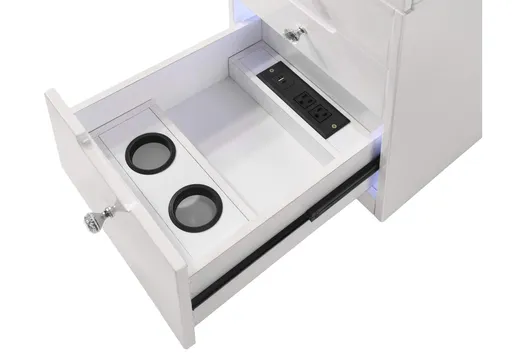 Step into a world of glamour with this sleek and chic vanity set, a perfect fusion of functionality and fashion. Its glossy white finish and clean lines are complemented by the sparkle of crystal-like knobs, adding a touch of sophistication to your personal space. The spacious tabletop, graced with a large mirror surrounded by radiant lights, offers an ideal stage for beauty routines, ensuring flawless makeup application under impeccable lighting. With a variety of drawers, this vanity provides ample storage to keep essentials organized and within reach. Interior drawer lighting, integrated outlet, and hidden drawer storage are just some of the included features.