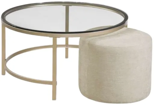 The Anderson cocktail table is a stylish and functional piece, perfect for modern living spaces. It features an elegant antique gold metal base that supports a clear glass top, creating a light and airy feel. Nestled underneath is versatile upholstered ottoman in a soft cream chenille fabric, complete with casters for easy mobility.