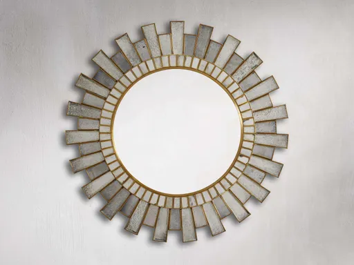 Beautifully juxtaposing antique and contemporary design, our exclusive Este mirror brings charm to any space. Geometric rings of antiqued glass mirrors surround a clear glass center to create this unique statement piece featuring warm brass accents for a touch of glamour.