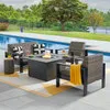 Chelsea Textured Black Aluminum and Weathered Teak Outdoor Wicker Concealed Cushions 4 Piece Loveseat Group 42 in Sq Fire Pit Table | Furnzy.com - Shop local furniture stores in one place