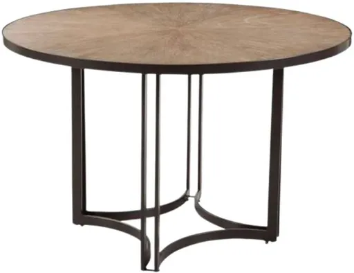 The Trucco Round Dining Table features modern transitional styling. The round, brown poplar wood top sits on an angular metal base. The steel frame is finished in a bronze powder coated finish, and is completed with adjustable floor levelers. Comfortably seats 4 people.