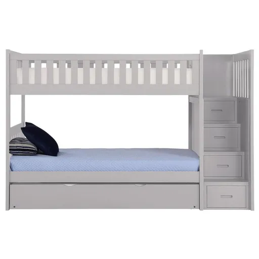 How fun is the Balto Gray Twin Bunk Bed w/Trundle? This creative wooden bed is every kid's dream! Its vertical slat headboard and footboard, concealed handles, and transitional style make it perfect for any room. Plus, with a staircase that can be installed on the left or right and built-in snag-free storage drawers, it's sure to get the parent seal of approval.