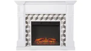 Blend classic style and modern convenience with this freestanding Enright Fireplace. Sleek marble forms the unique surround pattern, bringing contemporary flair to your family room or dining area. Flickering LED flames craft a realistic fireplace look in your space, while glowing faux fire logs add ambiance, with or without heat. Spend cozy evenings around the fire when you bring home this small space electric fireplace. <strong>Do not place TV on Mantel.</strong>