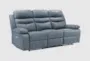 The Marigold Blue Leather 86" Power Reclining Sofa with USB is a perfect addition to any living room. This casual style sofa is upholstered in 100% leather that matches beautifully with its blue color. Designed for comfort and convenience, it features padded arms and pillow top armrests to enhance your relaxation experience.