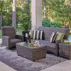 The Tribeca Collection contains concealed cushion seating composed of browns and greys for a versatile look that blends with every style. Each piece in this 3 piece swivel sofa seating group is handwoven with 9mm half round PE synthetic strands of resin wicker, treated with UV inhibitors, over a fully welded, handmade aluminum frame with a multi-step powder-coated finish and supported inner walls. The coffee table includes a tempered 5mm beveled glass top. Sink into the triple-layer construction and quick-drying, concealed reticulated foam cushions of the sofa and swivel glider club chair and relax in comfort. The cushions, wrapped in PVC texteline to hold their shape, are built-in, so you don't have to worry about securing them or readjusting.