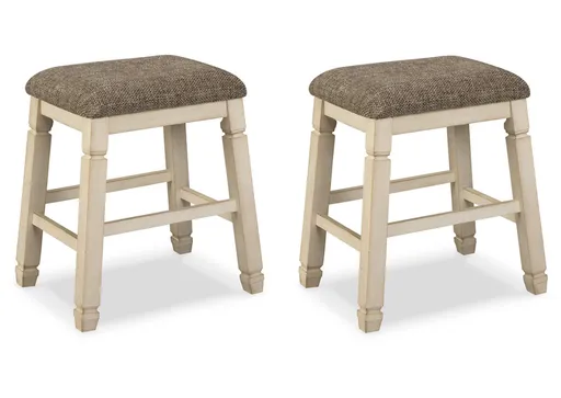 The beauty of the Bolanburg upholstered bar stool is something to savor. Designed to serve up comfort and flair, this backless bar stool entices with a saddle seat covered in a heavy woven fabric that complements the antiqued white finish.