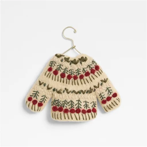 Cozy up your Christmas tree with these irresistibly snuggly sweater ornaments. Crafted of creamy felted wool, the sweater is sewn by hand with a wintry Fair Isle pattern in green and red. As a final touch of charm, each sweater is hung on a teeny gracefully looped metal hanger finished in gold. Our exclusive ornament makes a delightful package topper (especially for the gift of a sweater).