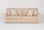 The Carina Wicker Beige Fabric 99" Sofa is a perfect addition to your living room, offering both comfort and style. Its traditional design features rolled arms and a loose back, making it a timeless piece for any home. Upholstered in 100% polyester fabric, this sofa provides a soft and inviting seating experience.