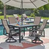 The Portofino Collection features a bold and modern look that is built for long-lasting durability and will provide you with the perfect backyard patio experience. Each piece in this 5 piece swivel dining set has an extruded aluminum frame with weather-resistant properties such as a powder-coated finish with an oven-baked clear coat. The breezy Sunbrella® sling swivel rockers have a fully welded and aluminum braced frame. Settle into the full-sized, high-back chairs with lumbar support and relax in comfort. The 43 in. square dining table features an extruded aluminum slat top design with tapered and angled legs, and an umbrella hole that accommodates any of our umbrellas.