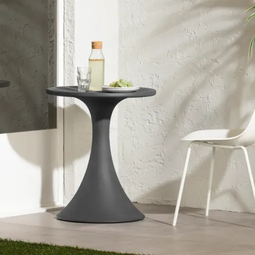 After a long day, sit back and enjoy the sunset at your Dalya dark gray outdoor bistro table! Suitable for both indoor and outdoor use and ideal for small spaces, its curved shape and clean silhouette make it a timeless option for your home. This bistro table is made of polyethylene, a very resistant type of plastic that will stay beautiful for a long time. You don’t have to worry about UV rays, cold temperatures, or even scratches—its appearance will stay intact! It is designed to withstand a variety of weather conditions, making it a 4-season piece that can be left outside all year long. Available for Online Purchase Only. Ships Directly from the Manufacturer. RC Willey Delivery is Not Available. Assembly required.