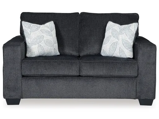 If style is the question, then this loveseat is the answer. Sporting clean lines and sleek track arms, the decidedly contemporary profile is enhanced with plump cushioning and a chenille-feel upholstery that's so pleasing to the touch. Sure to play well with so many color schemes, this loveseat in slate gray includes a pair of understated floral pattern pillows for fashionably fresh appeal.