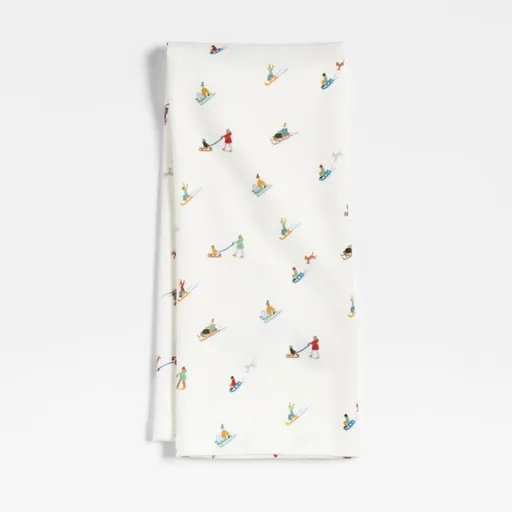 Our snow-white dish towel stands in for a perfectly powdered hill, sprinkled with enthusiastic sledders bundled up in colorful winter gear. (We especially love all of the dogs joining in on the fun.) Woven of organic cotton, the dish towel reverses to terrycloth to effectively dry counters, hands and dishes. Or use to gift wrap festive bottles to keep on hand for holiday hosts.