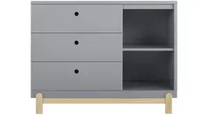 Bring style and convenient storage to your little one's bedroom with the Poppy 3 drawer dresser with cubbies by Delta Children. This wood dresser features three drawers to keep shirts, pants and socks, while the other side features two open cubbies to house books, bins or toys. Modern and playful, this versatile dresser features a natural wood base and feet paired with a contrasting finish on top for a look that works from baby to big-kid. This dresser is UL Stability Verified, tested to ASTM F2057 Furniture Safety Standard, the voluntary industry tip over standard for dressers. For additional security, it is recommended that all dressers in your home be anchored; all dressers include a wall anchor.