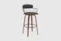 The Priscilla 30" Swivel Walnut Wood Barstool in Black Faux Leather with Golden Bronze Metal is a modern addition to your dining room or kitchen. Its sleek design and comfortable high back make it a stylish and functional piece. The smooth swivel feature allows for easy movement and accessibility.