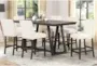The Strine Dark Brown Wood Counter Table with Upholstered White Counterstools Set for 6 brings a touch of glam to your dining or kitchen space. Designed with a rectangular Parsons style and a trestle base, this set combines a dark wood table with off-white cushioned counterstools. The tall, counter-height design makes it perfect for casual dining or entertaining.
