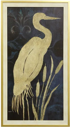 A gold frame surrounds this graceful image of a crane. The golden crane against the black background creates a very pleasing aesthetic. If you are searching for an elegant, bold piece of art, this is it!