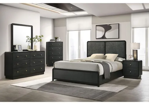 Reimagine your bedroom entirely with the sophistication of a modern bedroom set. It focuses on a chic upholstered bed that features a pair of padded panels with charcoal fabric that creates a soft, inviting presence that\'s perfect for lounging while maintaining a refined look. Storage pieces add ample space for organization. The dresser includes a mirror that lightens the look and provides reflectivity and a place for beauty rituals. A black finish is paired with old finish hardware, creating a touch of glam allure perfect for a sophisticated bedroom.