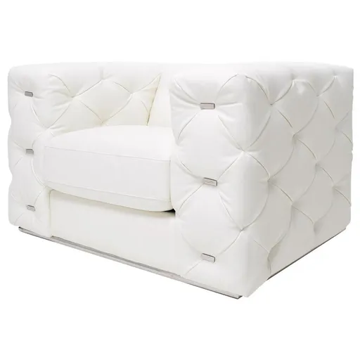 The Alegro Chair is a beautiful addition to a living room or bedroom. The ivory white leatherette is soft to the touch with high arms and the perfect diamond tufted pattern covered with decorative metal accents for your mid-century transitional style.