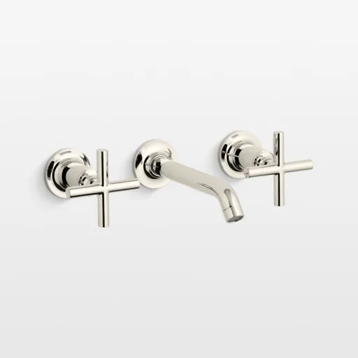 A Kohler faucet from our curated selection instantly transforms your bathroom, whether you're simply swapping out an old faucet or going for a total makeover with one of our bathroom vanities. Striking in polished nickel, the minimalist Purist wall-mounted sink faucet delivers high style and a clean look. The set provides streamlined water control with a 35-degree angled spout angle and easy-to-operate cross handles for independent regulation of hot and cold water.