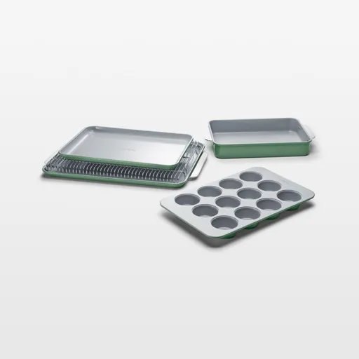 You'll be smitten with this beautifully designed bakeware set that's as amazing to look at as it is to use. Featuring minimalist designs, sage green exteriors and a non-stick ceramic finish, these pans are a joy to cook with. The set—medium and large sheet pans, muffin tin and rectangular pan—is versatile enough to take on any recipe and makes a fabulous wedding, graduation or housewarming gift. To keep things orderly inside kitchen cabinets, the five-piece set includes an organizer that corrals all of the components.