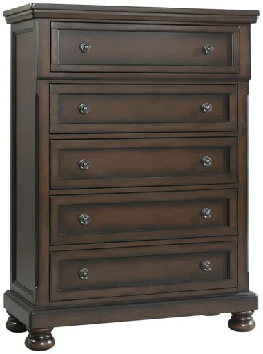The Kingston chest blends classic elegance with functionality. Its rich walnut finish adds warmth and sophistication to any bedroom. With five drawers, it offers ample storage for clothes and accessories, combining timeless style with practical organization for a refined living space.