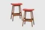 The Baylor Red Wood Saddle Kitchen 25.5" Counter Height Stool Set offers a modern touch to your dining room or kitchen. These stools are designed with a curved saddle seat that provides comfort and style. The walnut wood finish complements the vibrant red fabric cushion, making them a bold addition to any food prep or serving space.