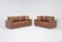 The Alicia Saddle Brown Vegan Faux Leather 2 Piece 90" Sofa & Loveseat Set is a perfect addition to your living room. This set features loose, reversible backs for added comfort and versatility. Upholstered in faux leather, it offers a casual yet modern look that complements any decor.