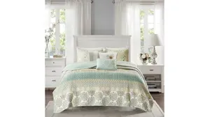 For a clean, cottage feel in your bedroom, Willa 6 Pc. Full/Queen Coverlet Set provides a mix of shabby chic with modern prints. Stripes feature florals, medallions, and geometric designs in green and shades of yellow and taupe. Two shams pull the floral design from the coverlet and three decorative pillows use coordinating colors to complete this look.