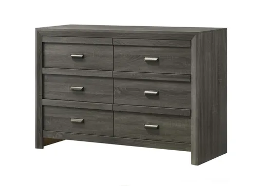This bedroom collection encapsulates a blend of contemporary design and rustic charm. The centerpiece, a bed with a distinguished chevron patterned headboard, evokes a sense of craftsmanship and texture, infusing the space with character. Flanking the bed are matching pieces, each exhibiting clean lines and a weathered wood finish that suggests a lived-in elegance. The dresser, complemented by a substantial mirror, along with the tall chest, offer ample storage solutions with understated metal handles that enhance the modern farmhouse aesthetic. A nightstand completes the set, its compact design making it a practical addition to the suite.
