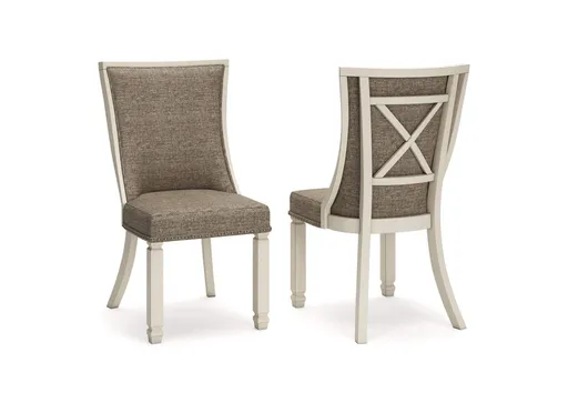 The beauty of the Bolanburg upholstered dining chair is something to savor. Contoured seat cradles you in cushioned comfort, while lattice peekaboo detail on the back makes this a striking chair from all angles. Heavy woven fabric adds textural interest that complements the chair’s antiqued white finish.