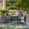 The Chelsea Collection contains concealed cushion seating composed of black and greys for a versatile look that blends with every style. Each piece in this 5 piece chat set is handwoven with synthetic flat strands of resin wicker, treated with UV inhibitors, over a powder-coated aluminum frame. Sink into the triple-layer construction and quick-drying, foam-padded cushions of the club chairs and relax in comfort. With cushions built-in, you don't have to worry about securing cushions or having to readjust them.