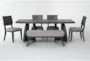 The Astra Black Dining With Dining Bench + Wood Chair Set For 6 perfectly combines modern style with functionality. This stunning set includes a rectangular dining table, a comfortable dining bench, and four sleek, armless wood chairs. The black heron finish and oak veneer enhance the sophisticated look, making it an ideal addition to any dining room or kitchen.