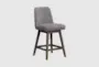 The Balder Swivel Counter Height Stool in grey oak wood finish with mocha stain resistant fabric brings modern style to your dining room or kitchen. Its armless design and swivel function offer comfort and versatility, while the stain resistant polyester fabric ensures durability. Crafted from rubberwood, this stool combines functionality and style effortlessly.