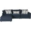 Elise 4 Piece Sectional with RAF Chair from Fusion Furniture. Includes RAF chair, Armless chair, Corner and Ottoman. Frame constructed of hardwoods and furniture grade plywood. Quality foam cushion core construction. Covered in a navy ink colored polyester fabric. Includes 2 accent pillows in Mundo Mystic, 2 accent pillows in Newton Spray and 1 kidney pillow in Karoo Mystic, not sold separately. Spot clean with water-free solvents, cc WS.