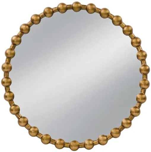 The Violette Wall Mirror boasts a modern round design with a luxurious gold leaf finish and elegant knob detailing on its frame. Its sleek and contemporary aesthetic adds a touch of sophistication to any room, elevating the overall decor effortlessly.