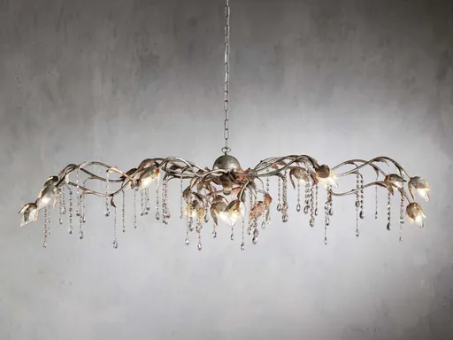 Like freshly fallen rain on draped garden vines, our Viticcio Chandelier is hand-moulded by Italian artisans from solid iron. Floral flourishes are elegantly accentuated by a hand-applied silver finish, and hand-strung crystals dangle to scatter drops of light around your space.