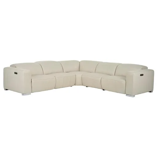 There's room for the whole family on the Samar Leather Power Reclining Sectional with 5PCS/3PWR. Made with genuine thick top grain leather, this couch offers power in the left, right and armless recliners. With built-in USB ports, block style chrome legs, channel tufted accents and deep, wide seating, this sofa is as functional as it is stylish.