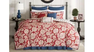 The Lucy Comforter Set is perfect for those seeking a traditional and comfortable atmosphere. The comforter features a timeless floral motif in a classic red, ivory, and blue color scheme. The comforter reverses to reveal a cozy red and blue striped pattern on an ivory ground. Three decorative pillows use embroidery and fabric manipulation to highlight the same elements seen on the comforter. Three decorative pillows, two shams, two shams, and one bedskirt are included with the comforter to complete this set.