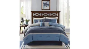 Create a warm update to your space with the Collins California king 7-pc. comforter set. This pieced suede comforter features shades of navy, medium blue and gray along with pleating for the perfect balance in this collection. Three Decorative pillows use quilting and piecing for the perfect finishing touches to this set.