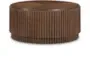 Introducing the Rodin Modern Brown 36" Round Fluted Drum Coffee Table, a stunning addition to your living room. This contemporary piece features a rich brown color and a unique fluted design, making it a perfect centerpiece for any modern home. Crafted from a combination of oak veneer, rubberwood, polyresin, and MDF, this coffee table offers both style and durability.