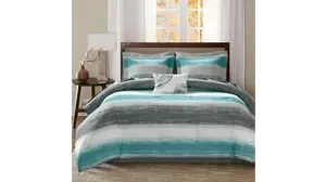 The Saben 7 Pc. Twin Complete Bed and Sheet Set provides a casual and modern update to your bedroom. A printed watercolor stripe motif, in aqua, grey, and white hues, is beautifully displayed on the ultra-soft microfiber comforter. The coordinating sham complements the pattern seen on top of the bed to pull the ensemble together. A 100% cotton sheet set includes a fitted sheet that fits up to a 14-inch mattress, a flat sheet, and a pillowcase in a textured grey hue to complement the casual style of the comforter. Completing the look is andecorative pillow in coordinating colors, while a solid grey bed skirt adds a creates a crisp finish to this incredibly soft complete bed and sheet set.