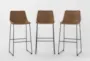 Enhance your dining or kitchen space with the stylish Cobbler Mocha Barstool Set. These modern barstools feature a sleek bucket seat design with baseball stitching, providing both comfort and a chic look. The combination of cognac faux leather and black metal legs makes these stools an ideal addition to any contemporary setting.