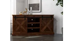 Bring "The Look" home today with the Farmhouse 66" Corner TV Console. Its wildly popular warehouse or barn style doors have become a staple in many homes across America. Reminiscent of simpler times, the appeal is understandable and undeniable. Featuring functional forged iron hardware and rolling doors.