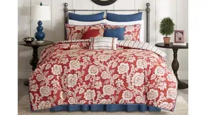 The Lucy Comforter Set is perfect for those seeking a traditional and comfortable atmosphere. The comforter features a timeless floral motif in a classic red, ivory, and blue color scheme. The comforter reverses to reveal a cozy red and blue striped pattern on an ivory ground. Three decorative pillows use embroidery and fabric manipulation to highlight the same elements seen on the comforter. Three decorative pillows, two shams, two shams, and one bedskirt are included with the comforter to complete this set.