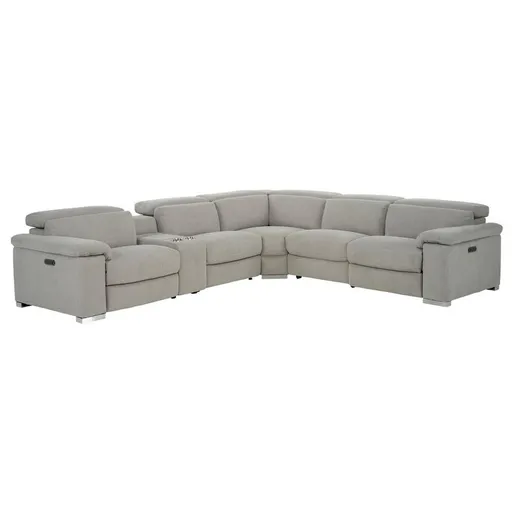 There's plenty of room to stretch out and relax on the Karly Light Gray Power Reclining Sectional with 6PCS/2PWR. Made with performance fabric, this modular sofa features adjustable headrests, and power motion in the right and left recliners. Its built-in USB-A ports add some high-tech luxury, and its storage console with beverage holder gives you plenty of space for your snacks and remotes. Plus, it's super stylish with its knife-edge padded armrests and block-style chrome legs.
